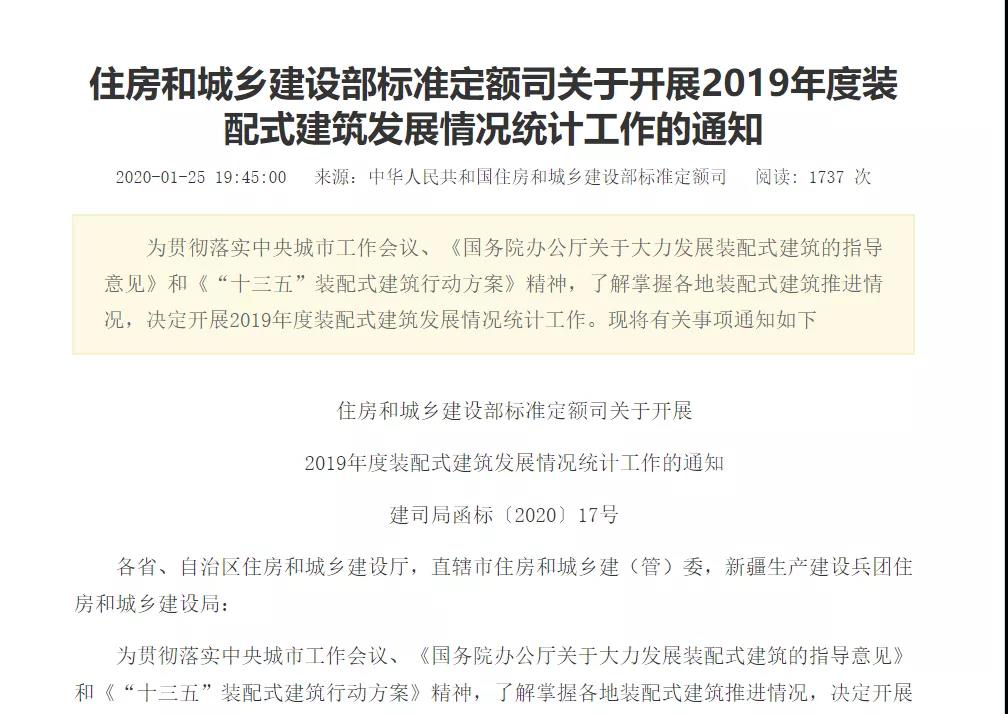 2020年1月25日,住房和城鄉建設部標準定額司關于開展2019年度裝配式建筑發展情況統計工作的通知,內容強調: